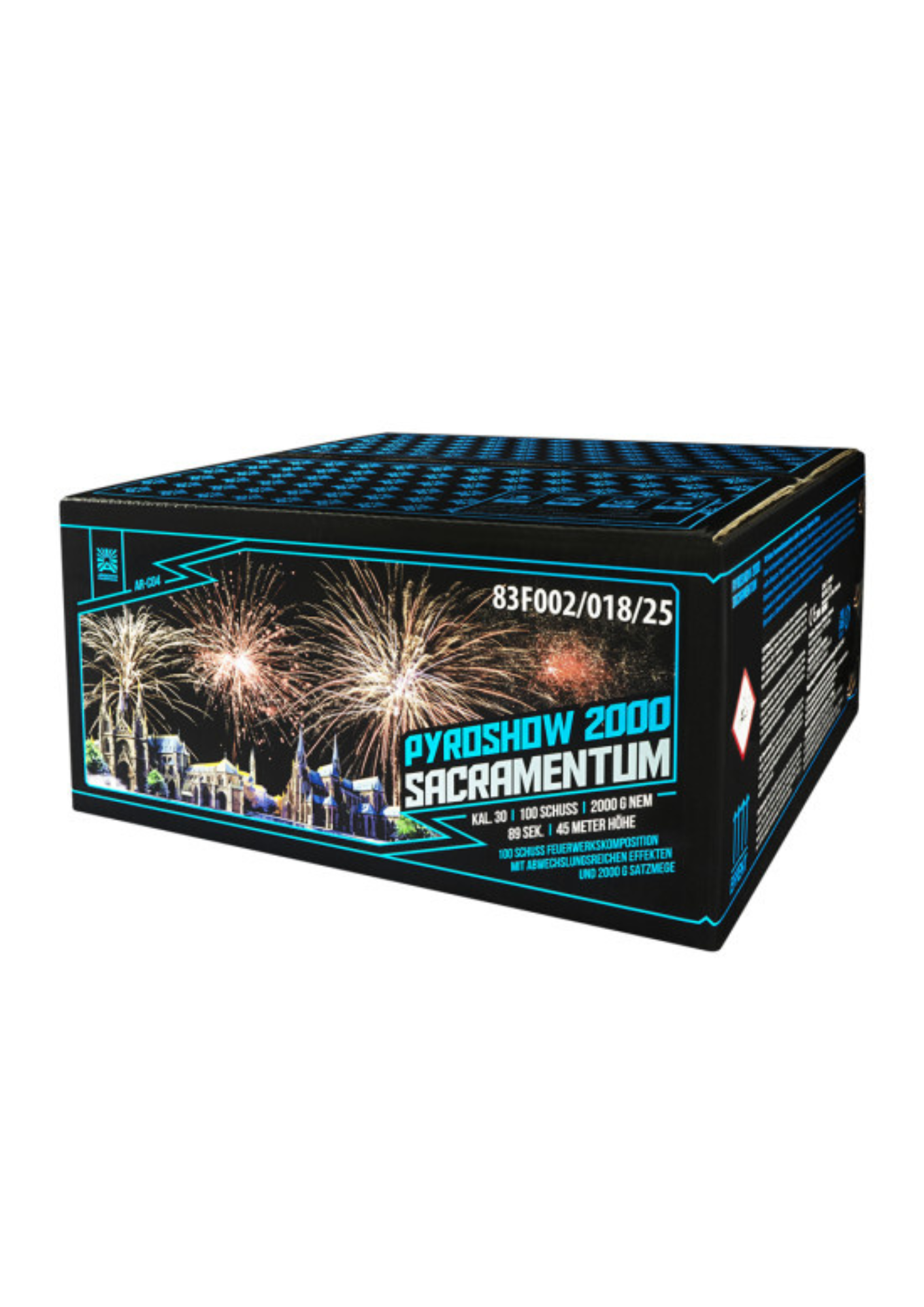 100 Schuss Feuerwerkskomposition in Kaliber 30mm aus folgenden Effekten: Blauer Leuchtspuraufstieg zu Blauer Päonie mit Titangoldpalme, Titangoldweide mit weißen Blinkspitzen, blauer Päonie mit Corollaweide und Brokatkrone mit weißen Blinkspitzen; Titangold-Schweifaufstieg zu Titangoldpalme mit roten Blinksternen, Titangoldweide mit grünen Blinkspitzen und Corollaweide mit roten Blinksternen; Brokatschweif-Aufstieg zu Brokatkrone mit grünen Blinkspitzen und Brokatkrone mit roten und blauen Dahliensternen; Corolla-Schweifaufstieg zu Corollaweide mit Dahlienstensternen in violett und grün; Titangoldschweif zu Titangoldweide mit silbernen Crackerspitzen und roten Blinksternen; Feuertöpfe aus Silbercrackern zu Silbercracker-Schweif zu Silbercrackern mit blutroten Dahliensternen als Finale