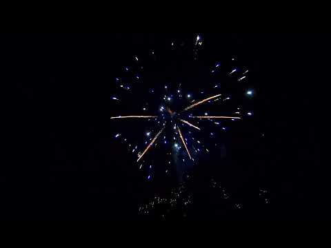 -Weißer Blinkschweif-Aufstieg zu Titangoldpalme mit blauen Sternen und weißen Blinkern.